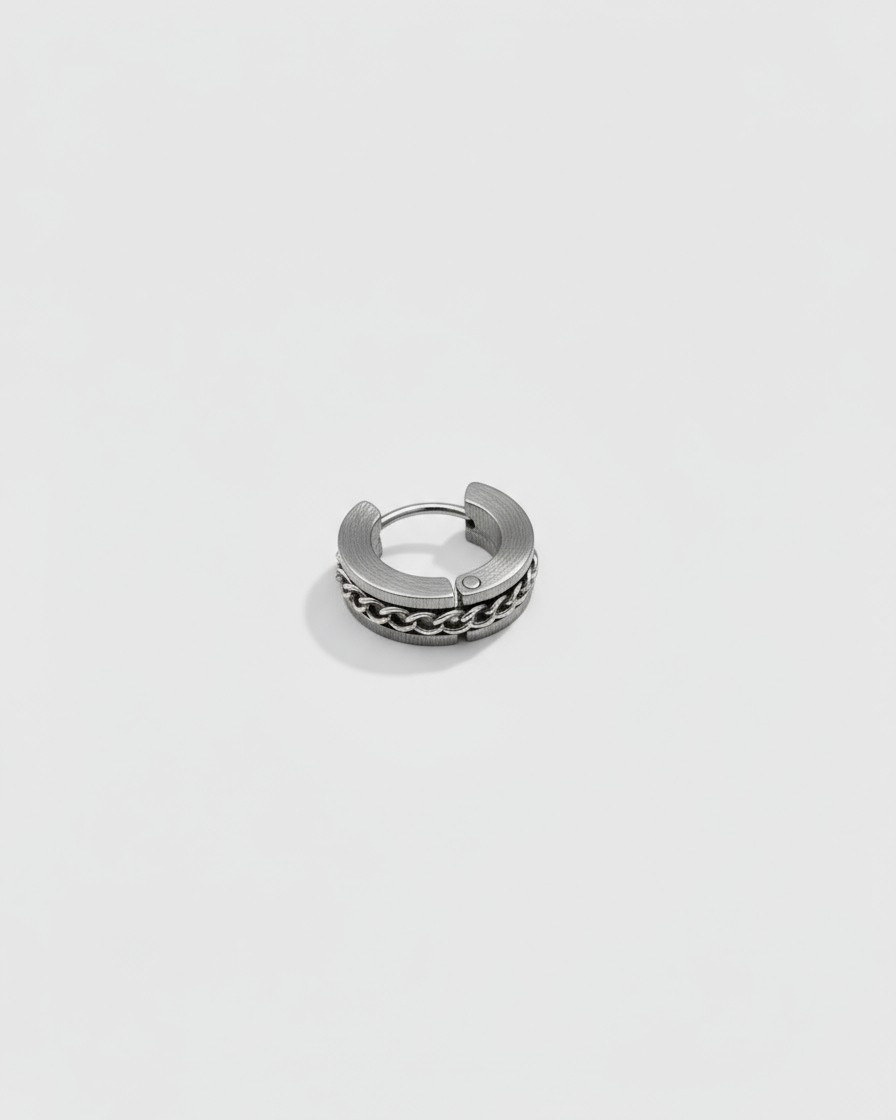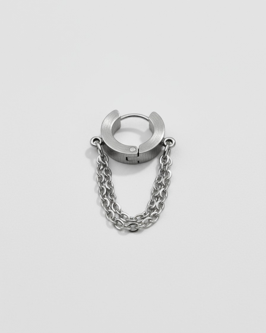 Boucles d’oreilles Chaînes – Créoles argentées reliées par une double chaîne, design graphique et moderne.