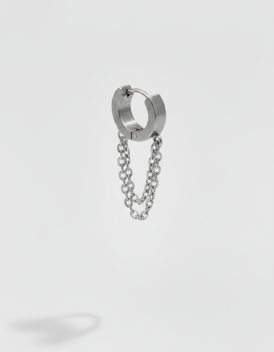 Issu de la collection Chaînes, ce modèle revisite la boucle créole classique avec une double chaîne. Elles jouent sur le contraste entre structure et fluidité.