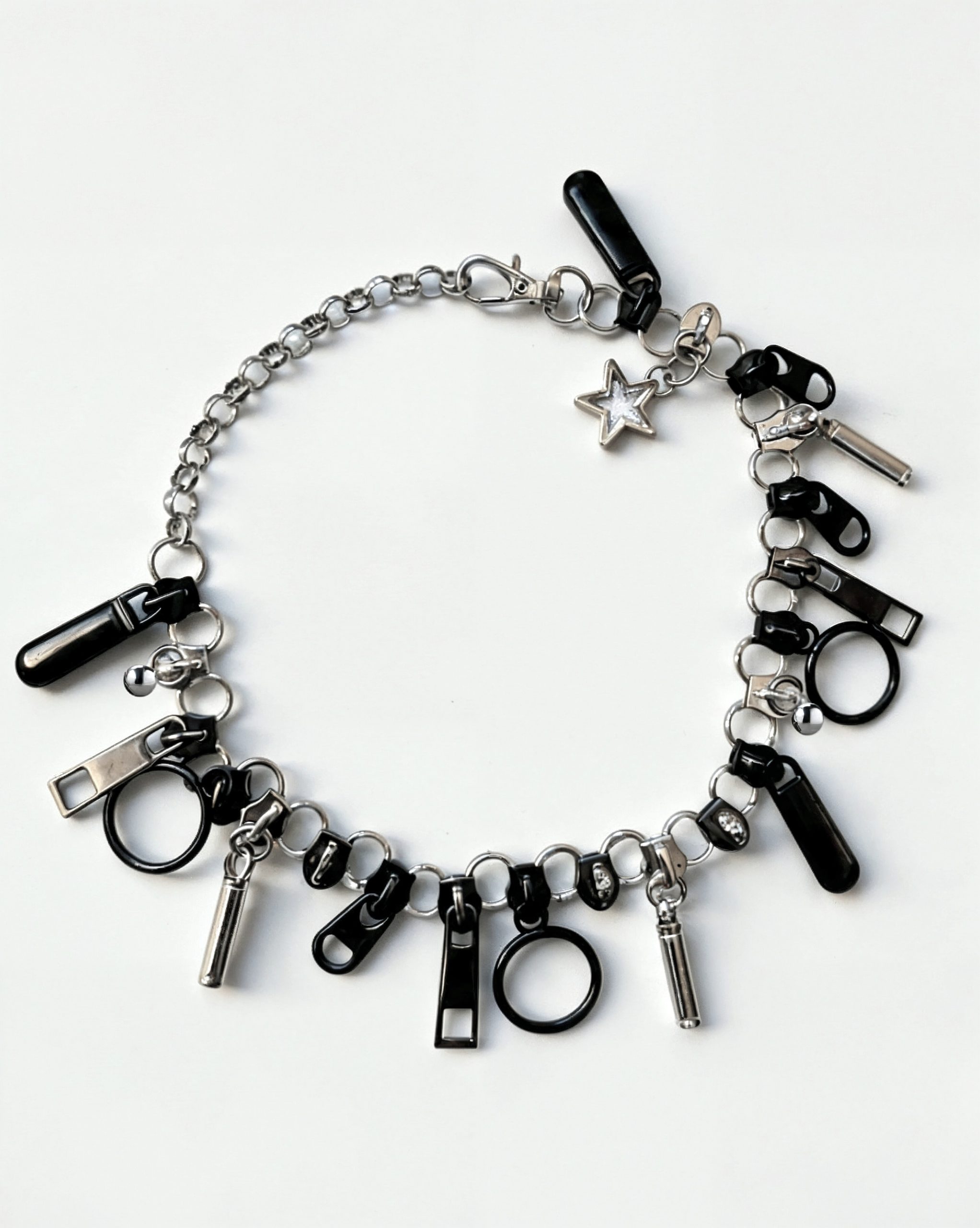 Collier en acier inoxydable inspiré de la fermeture à glissière. Curseur et spirale métalliques — icône du jean.